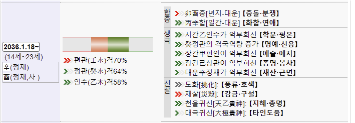 아래로 내리면 길성과 흉성을 확인할 수 있으며 오행과 십성 분석을 해줍니다. 돋보기를 누르면 자세한 설명도 나오니 함께 보시기 바랍니다.