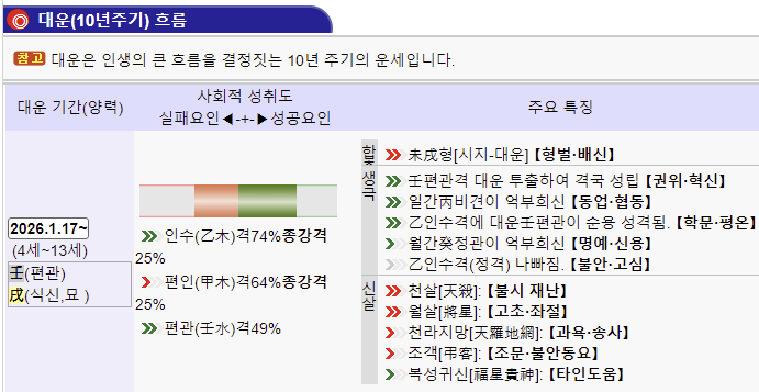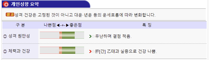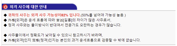 사주 명식표에 바로 사주 정보가 나오는데 사주 개요 및 특징은 만세력을 기준으로 사주풀이를 해놓은 것입니다.