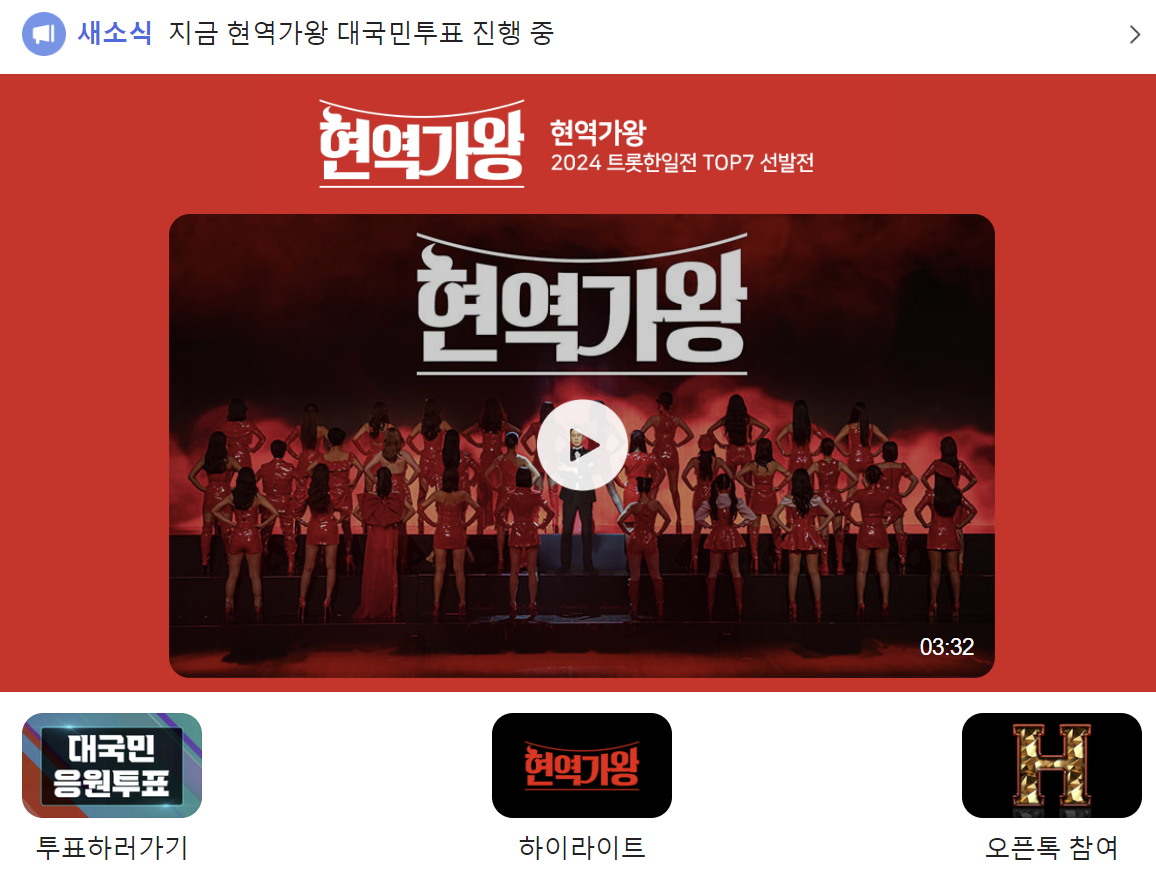 현역가왕 투표하기 매일 1회 아이디당 한번 투표할 수 있습니다. 온라인 대국민 응원 투표의 점수는 결승, 준결승전에 반영이 되어 우승자 선정에 중요한 지표가 됩니다.